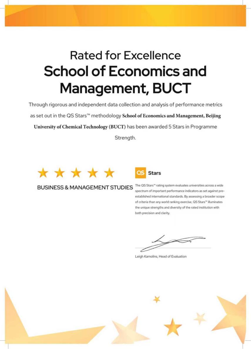 Thethree professional master's programs of School of Economics andManagement, Beijing University of Chemical Technology (BUCT) –Master of Business Administration (MBA), Master of EngineeringManagement (MEM), and Master of Professional Accounting (MPAcc) –have successfully obtained the QS Stars Five-Star Accreditation afterevaluation by QS (Quacquarelli Symonds), a world-renowned highereducation assessment organization. This significant achievement makesit the first professional master's program in a school of economicsand management in Beijing and even North China to win thisaccreditation. QS collectively refers to these three accreditedprofessional master's programs as "Business and ManagementStudies", which fully demonstrates the outstanding performanceof the professional master's programs of BUCT's School of Economicsand Management in internationalized education, teaching quality andindustry service capabilities, and their educational standards havebeen highly recognized by international authoritative standards.